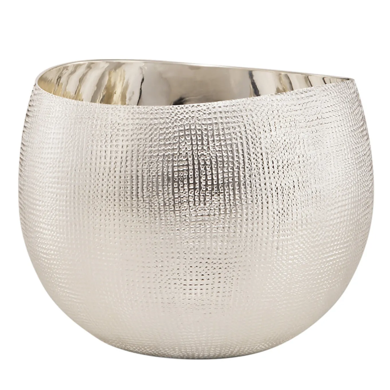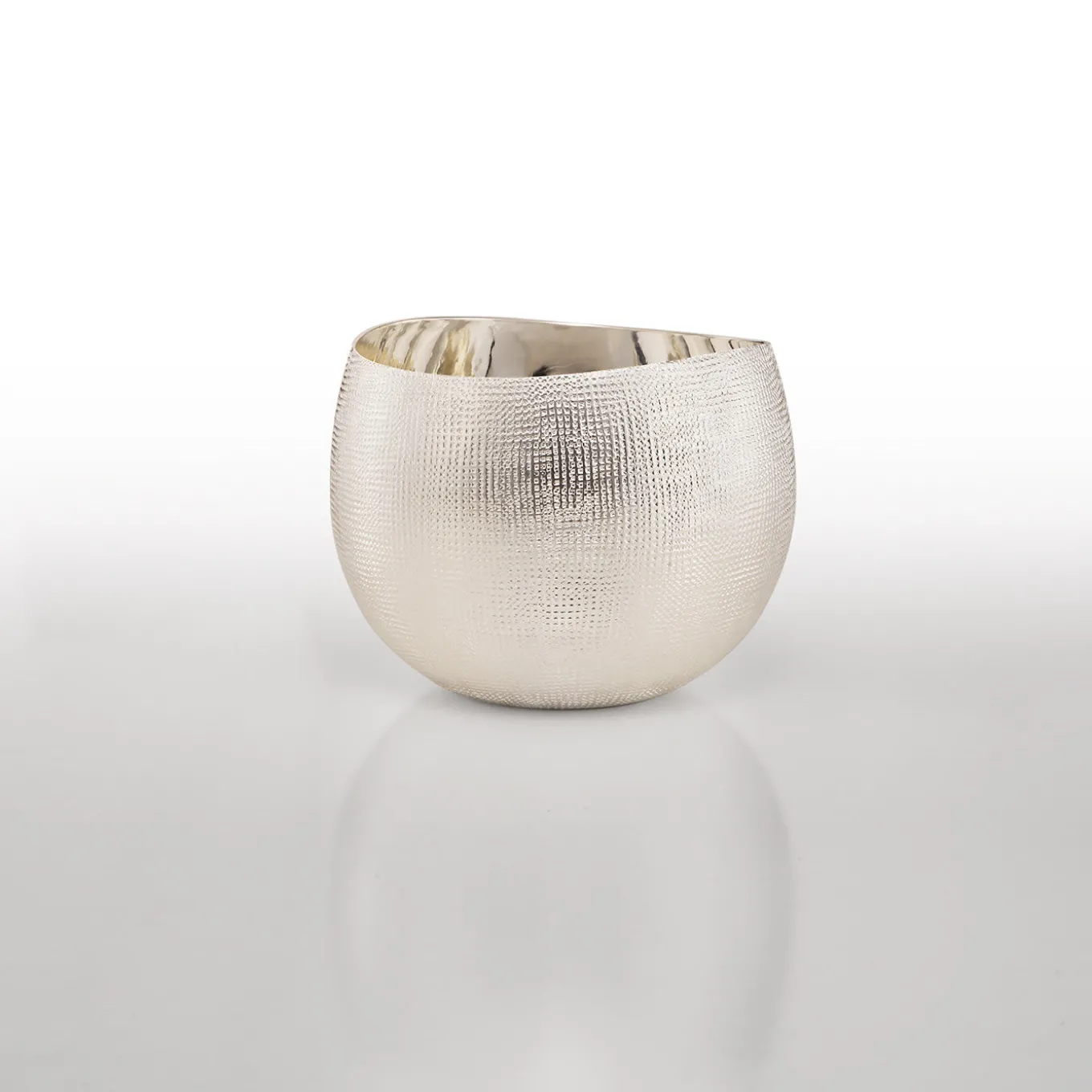 Delicato recipiente per bere realizzato in lega argentata con un’affascinante texture all’esterno e un interno dalla brillante lucentezza.