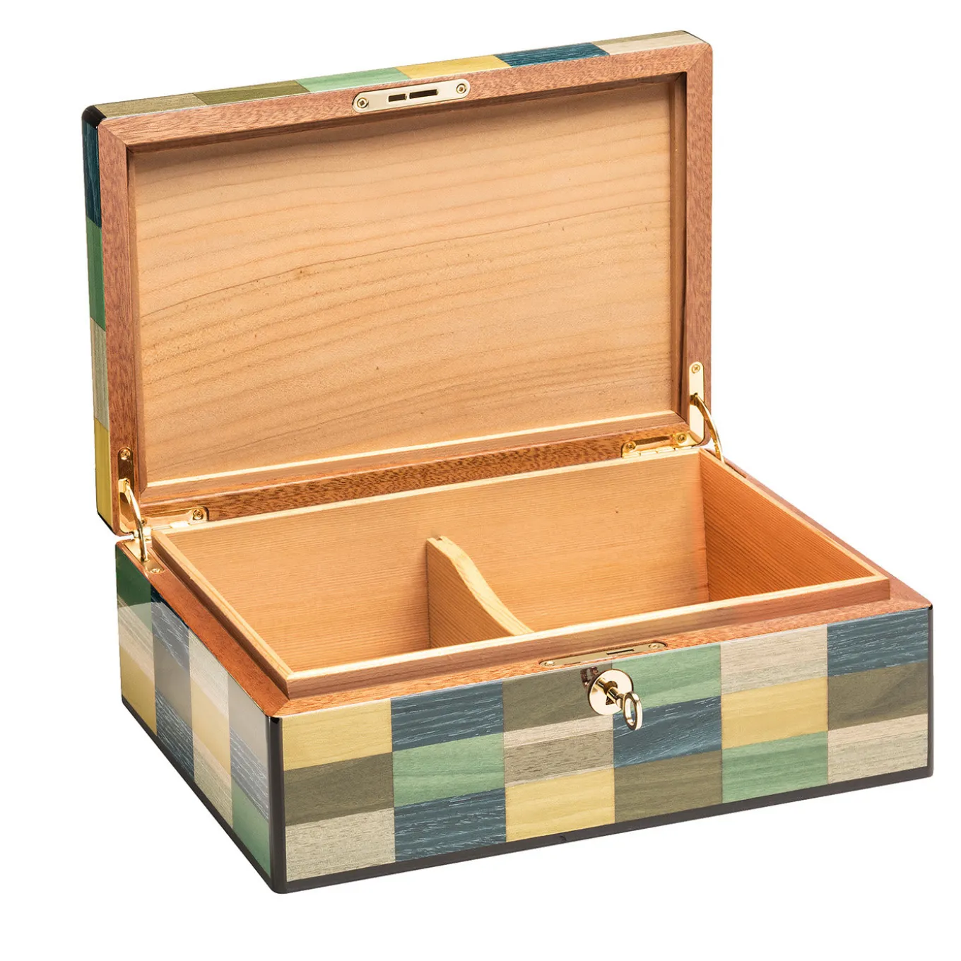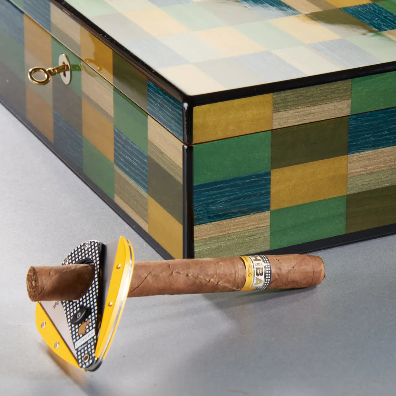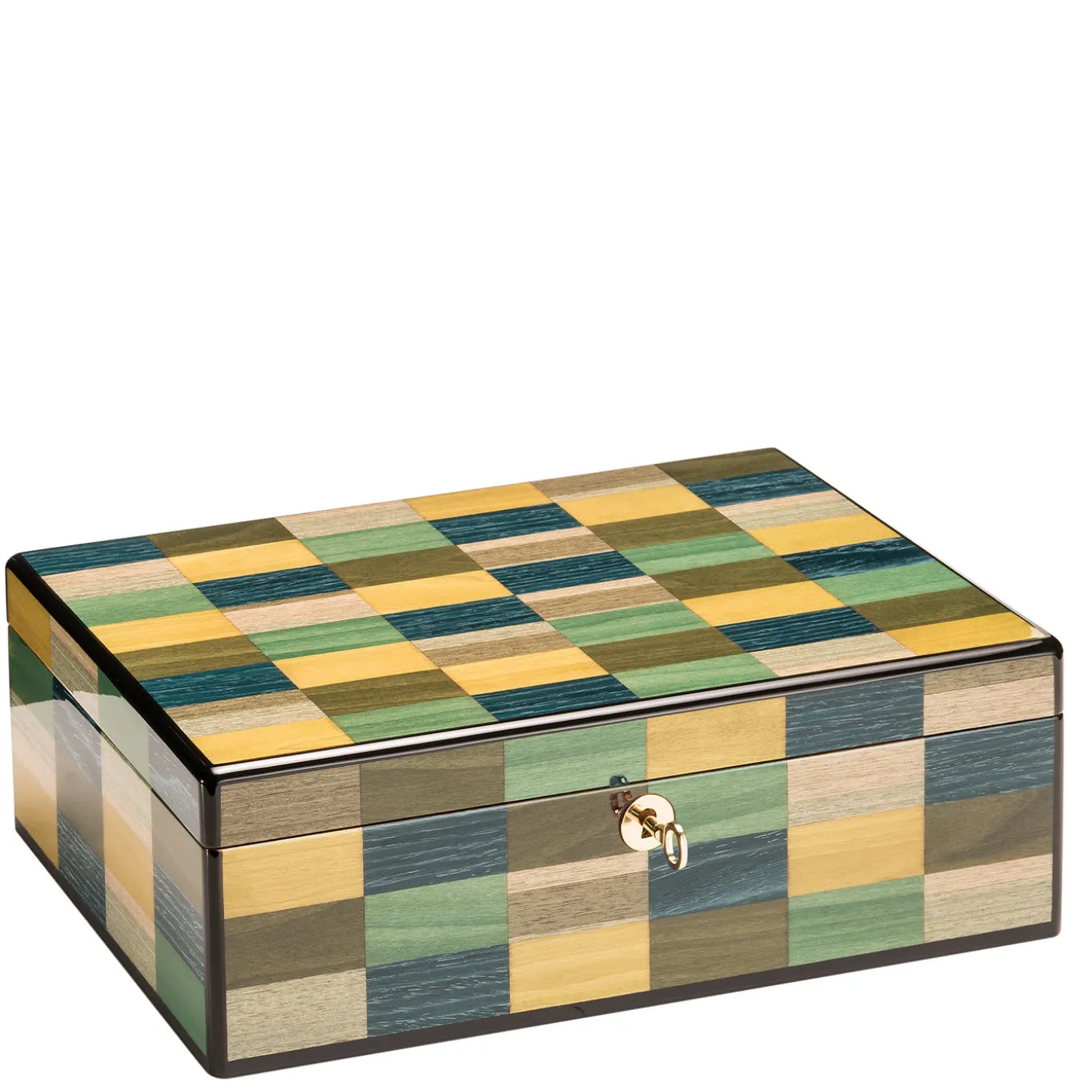Elegante e raffinato, questo portasigari è un oggetto d’arte versatile che completerà in modo superbo qualsiasi stile di arredamento. Realizzato e impiallacciato a mano con tecniche artigianali tradizionali, è realizzato in cedro e presenta uno splendido intarsio di rettangoli colorati, che ricorda un quadro d’arte moderna. Può contenere fino a 30 sigari, è arricchito da dettagli in metallo dorato e dispone di due scomparti interni.