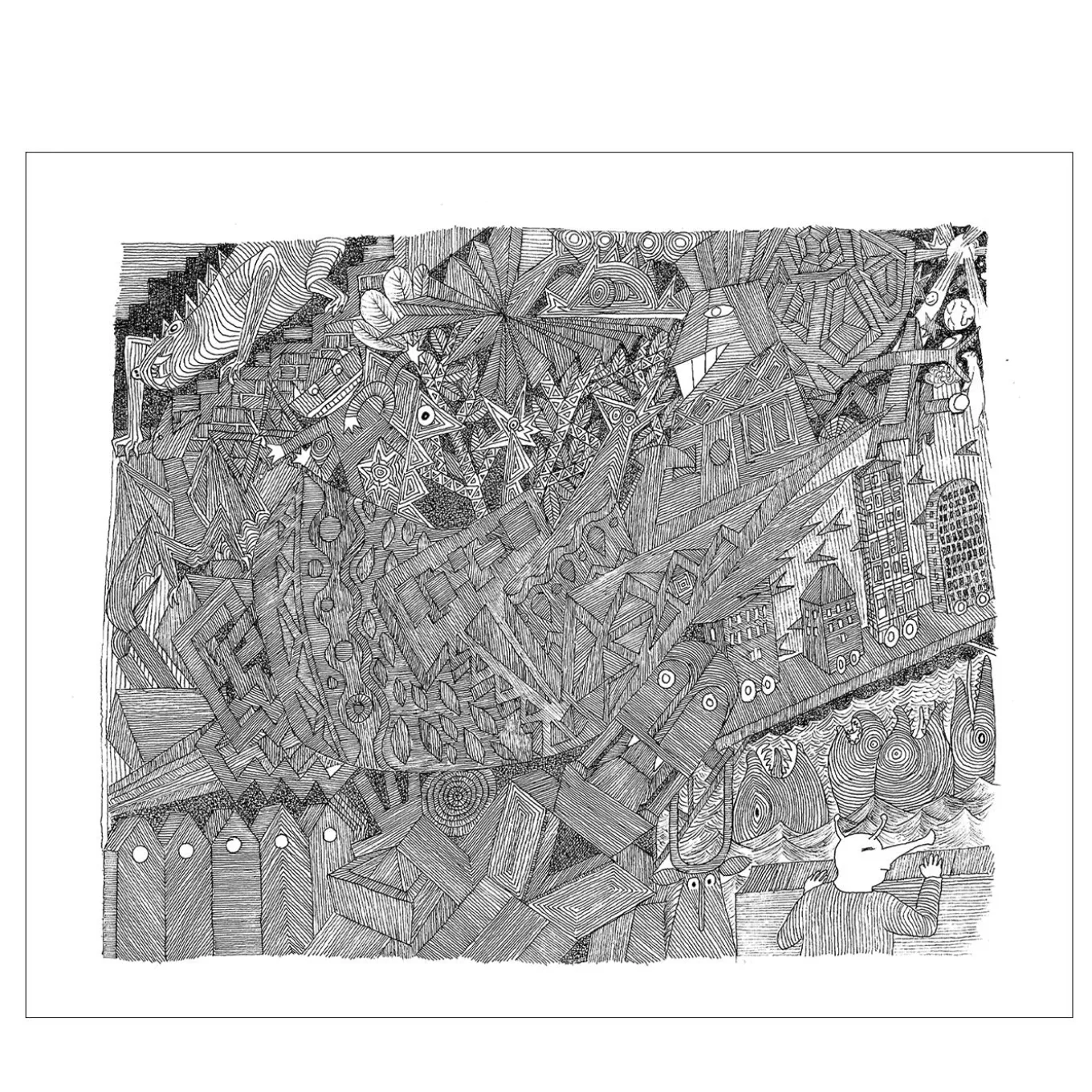 Una sapiente combinazione di linee sottili e strette che tracciano uno scenario ipnotizzante contraddistingue questo superbo dipinto. Quasi uno scorcio di un libro d’avventura scritto con inchiostro di china, permette di vagare con lo sguardo in uno scenario in cui si intrecciano senza soluzione di continuità personaggi imponderabili, mostri e colpi di scena. Il linguaggio artistico di Paul Klee viene omaggiato in quest’opera. Cornice non inclusa.