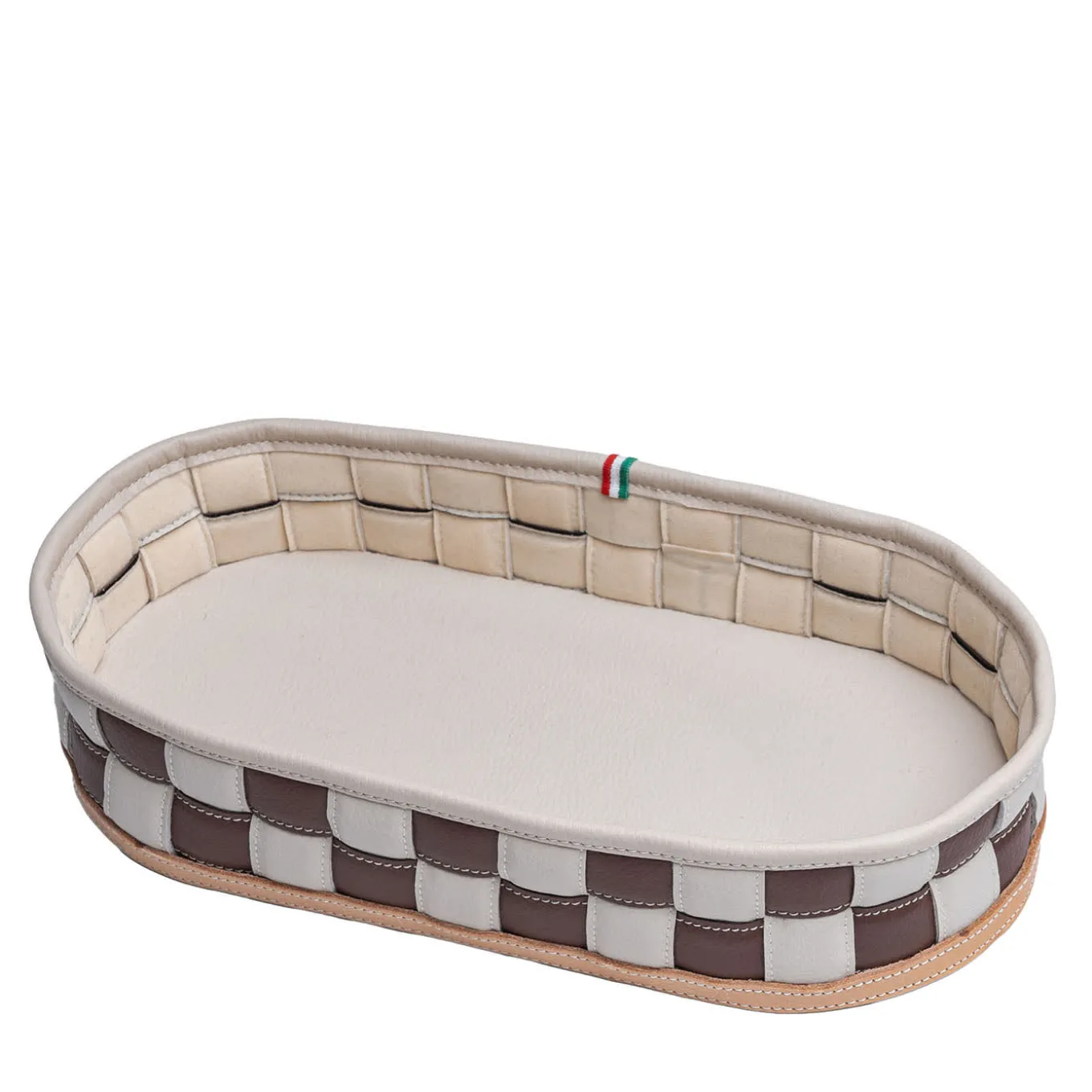 Una soluzione sofisticata per raccogliere le chiavi o le monete quando si torna a casa, questa videopoche ovale è una vetrina di stile sartoriale. L’ecopelle nei toni contrastanti del marrone e del crema è ordinatamente annodata in un design a quadri regolari che richiede semplicemente attenzione senza mai perdere la sua classe. Il fondo rigido massimizza la stabilità. Nel catalogo Artemest sono disponibili diverse varianti di dimensioni e colori.