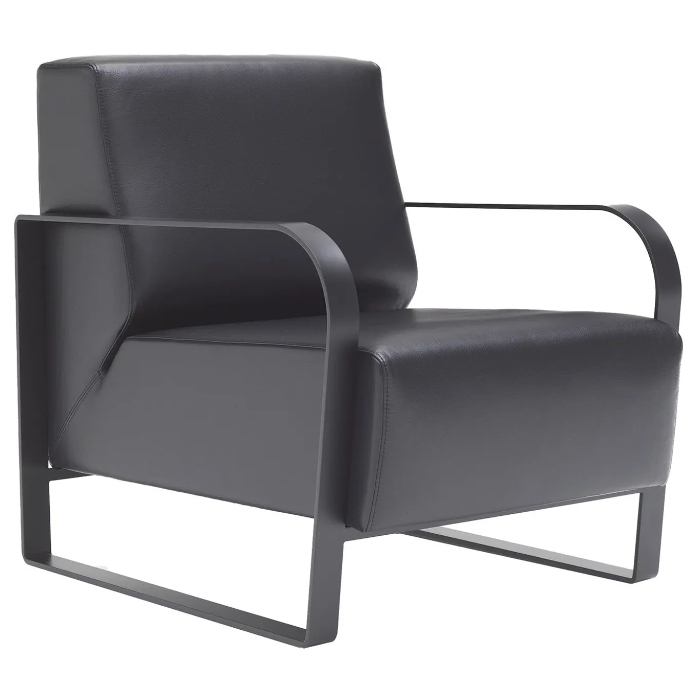 Questa poltrona imbottita è caratterizzata da una base a slitta in acciaio verniciato nero opaco. Eleganza e semplicità per ogni salotto.