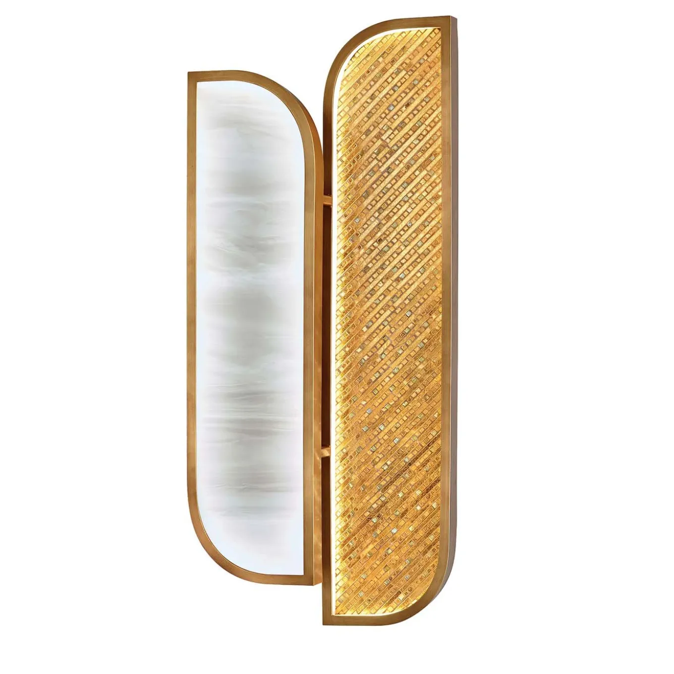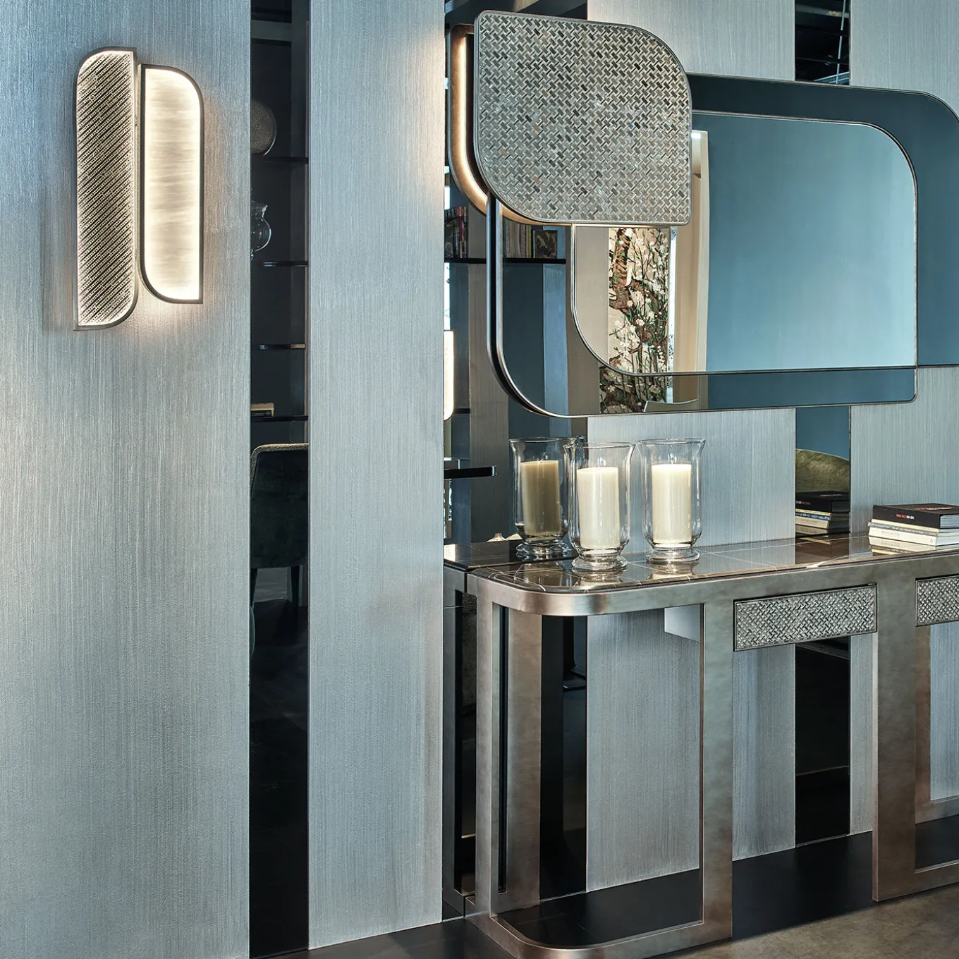Parte della collezione retro-chic, questa applique di Massimiliano Raggi presenta due elementi specchianti di dimensioni diverse che celebrano l’armoniosa coesistenza dei contrasti. Questo raffinato pezzo è realizzato in metallo con il piccolo elemento in ottone rifinito in argento antico, mentre l’altro è rivestito interamente da un mosaico composto da piccole tessere e inserti in Alicrite. Il pezzo è illuminato da due strisce LED da 22,2 W con temperatura colore 3000L e 2473 lumen. La tensione predefinita è di 220V, ma è possibile richiedere altre tensioni. Questa applique è certificata CE.
