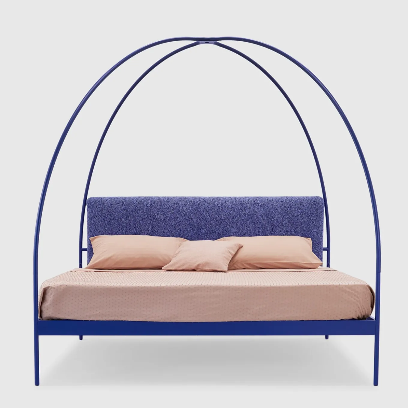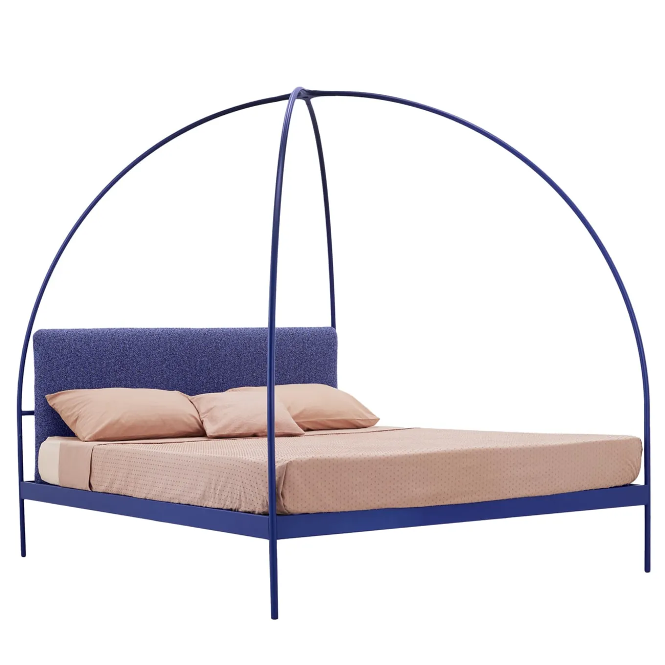 Eleganza e giocosità si fondono in questo letto matrimoniale con struttura a baldacchino a volta incrociata. Realizzata in ferro battuto blu, la struttura tubolare è costituita da una coppia di archi che incorporano i piedi e ospitano una sorgente LED proprio nel punto in cui le sue curve si intersecano. Dotato di una testiera imbottita in tinta per un maggiore comfort, il letto promette sessioni di lettura rilassanti grazie alla possibilità di attenuare la luce a piacere utilizzando i pulsanti sulle gambe posteriori. Il LED non è incluso.